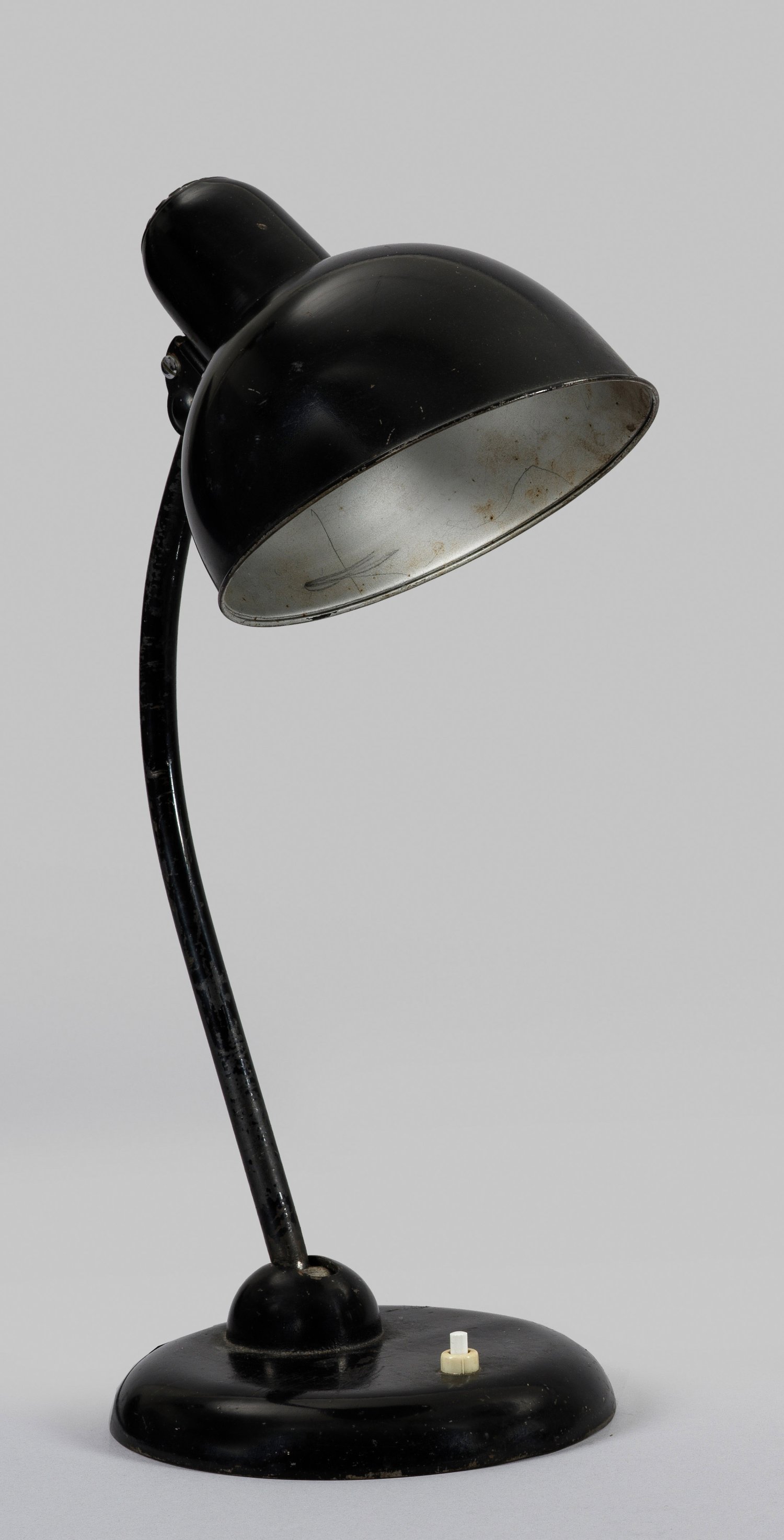 Modell 6551. 1-flg.; Metall, schwarz lackiert. Über flachem Rundsockel gebogter, schwenkbarer Rundschaft mit Kugelelementen für Basis und gewölbtem, variablen Schirm. Entw. Christian Dell, 1930er Jahre. Bez. Original Kaiser Idell. Elektrifiziert. Altersspuren. H. 42 cm.