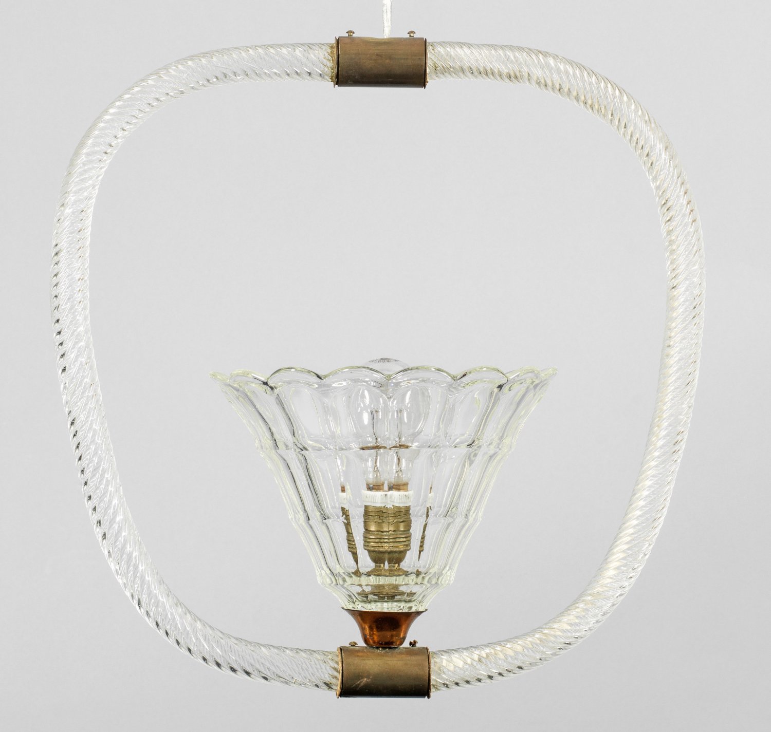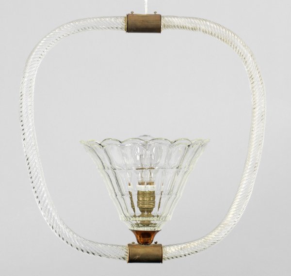 1-flg.; Farbloses Muranoglas und Messing. Offen gestalteter Korpus aus stark gebogtem, in sich gedrehten Rundstab als Träger für Leuchtmittel mit kelchförmigem Lampenschirm. Unvollständig. Unbez.; H. 40 cm. 39 cm x 20 cm.