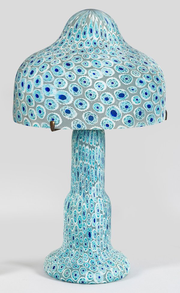 1-flg.; Farbloses, satiniertes Glas mit Murrinen in Weiß und unterschiedlichen Blautönen. Geschweift ansteigender Rundsockel in sich konisch verjüngenden Schaft übergehend, als Träger für Leuchtmittel. Korrespondierender, kuppelförmiger Lampenschirm. Elektrifiziert. H. 50 cm.