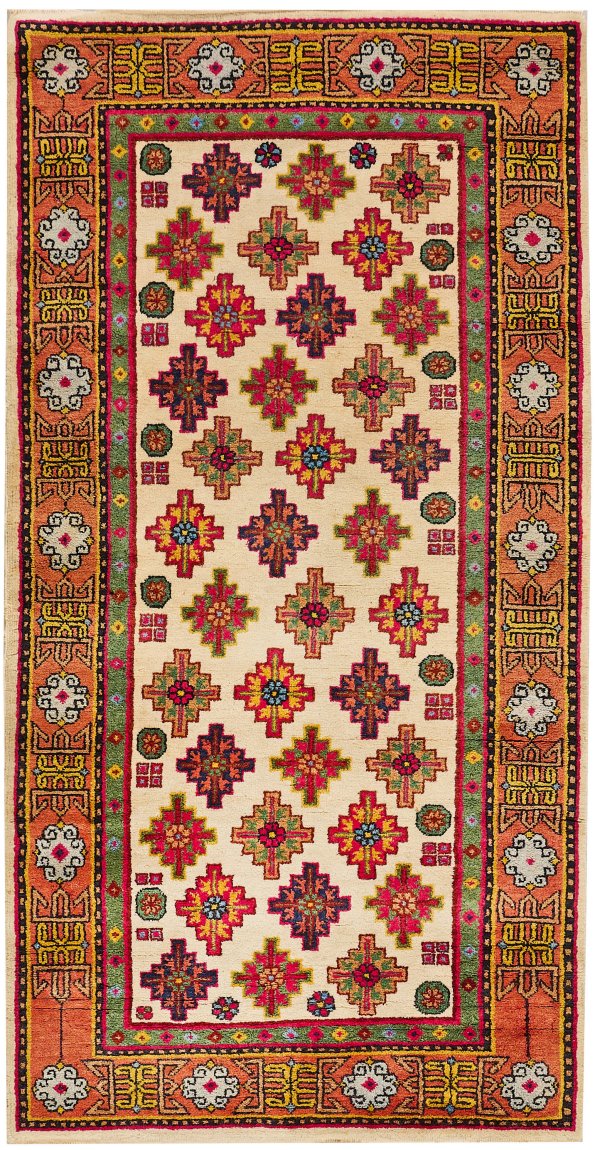 Tibet. Wolle auf Baumwolle. Im elfenbeinfarbenen Innenfeld flächendeckende Musterung aus Rautenmotiven im Rapport. Umlaufend apricotfarbene Hauptbordüre, flankiert von dunklen Bändern. 93 cm x 180 cm.