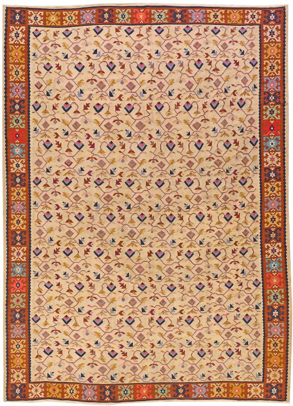 Wolle auf Baumwolle, flach gewebt. Im beigefarbenen Innenfeld flächendeckend verlaufende Musterung aus dicht angeordneten Blattranken in unterschiedlichen Beigetönen und stilisierten Blüten. Umlaufend breite, rotbraune Bordüre aus gereihten Arabeskmotiven in unterschiedlichen Blau-, Grün- und Gelbtönen. 250 cm x 350 cm.