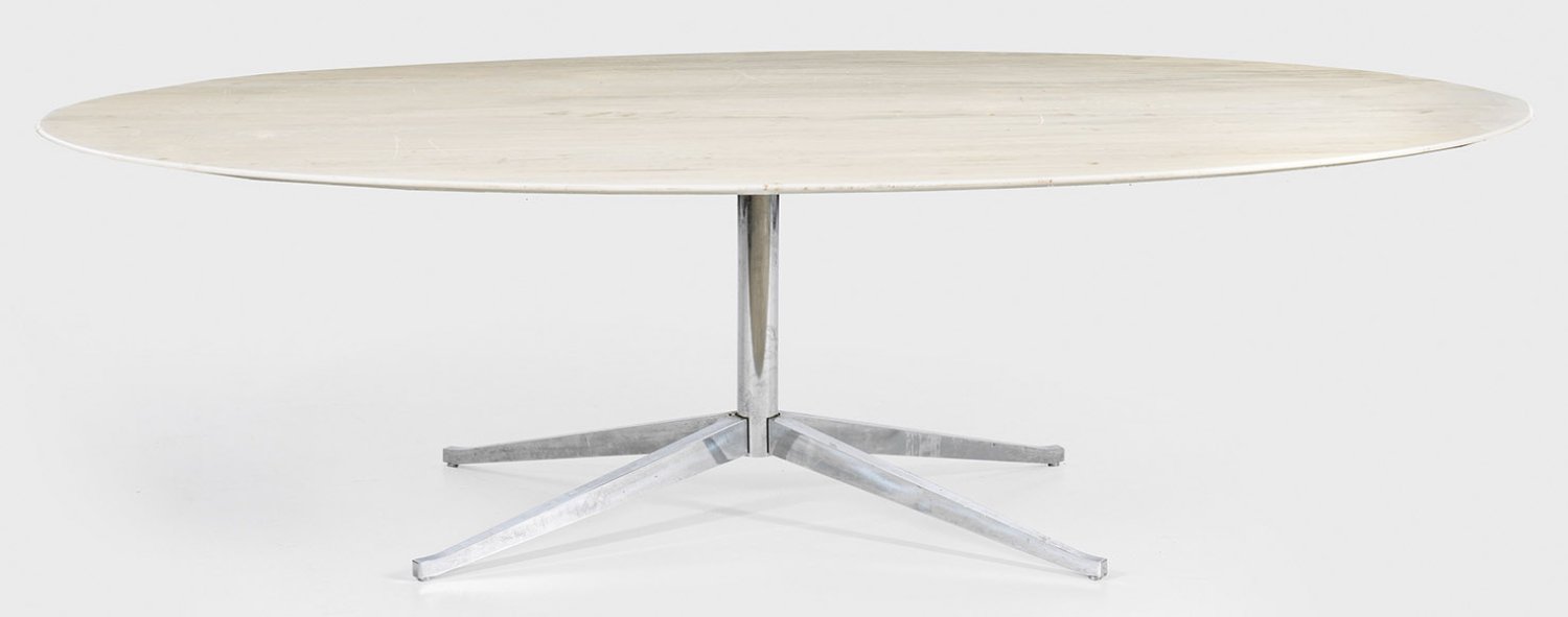 Metall, verchromt bzw. schwarz lackiert und weißer, hellgrau gemaserter Marmor. Über schmalen Streben schlanker Rundschaft als Träger für ovale, besch. und teilw. rest. Deckplatte. Unbez., Entw. Florence Knoll, 1961. H. 70 cm. 245 cm x 134 cm.
