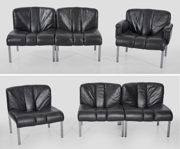 4-bzw. 6-tlg.; Zwei Sessel sowie vier zu zwei Sofas verschraubte Sessel. Verchromter Stahl und schwarzes Leder. Gestell aus gebogten Flachstreben als Träger für gerundete Sitz- und Lehnenfläche. Teilw. breite Armlehnen. Herstellerzeichen. Entw. Hans Eichenberger. Altersspuren. Sessel-H. 70 cm. 65 cm x 69 cm.