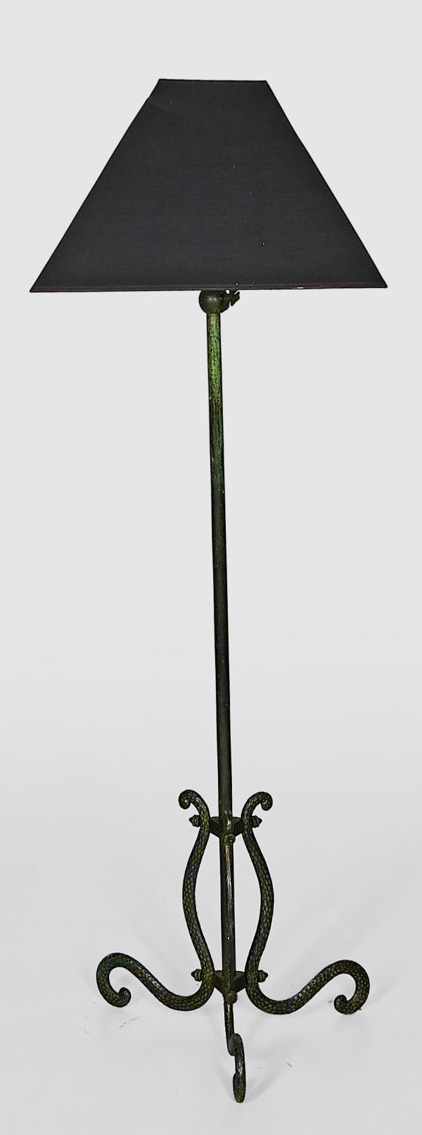 1-flg.; Eisen, braun-grün patiniert. Schlanker Rundschaft auf stark geschwungenen Volutenmotiven mit flächendeckendem Hammerschlagdekor als Träger für Leuchtmittel. Oberhalb konischer Lampenschirm. Ehemals elektrifiziert. Erg.; H. 144 cm.