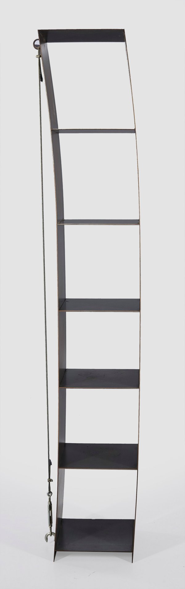 sog. gespanntes Regal. Stahl, dunkel patiniert. Hoher, schlanker, zur Seite gebogener und optisch durch gespanntes Drahtseil gehaltener Korpus mit insges. sechs Ablageflächen. Unbez.; Entw. Wolfgang Laubersheimer, 1984. H. 207 cm. 38 cm x 31 cm.