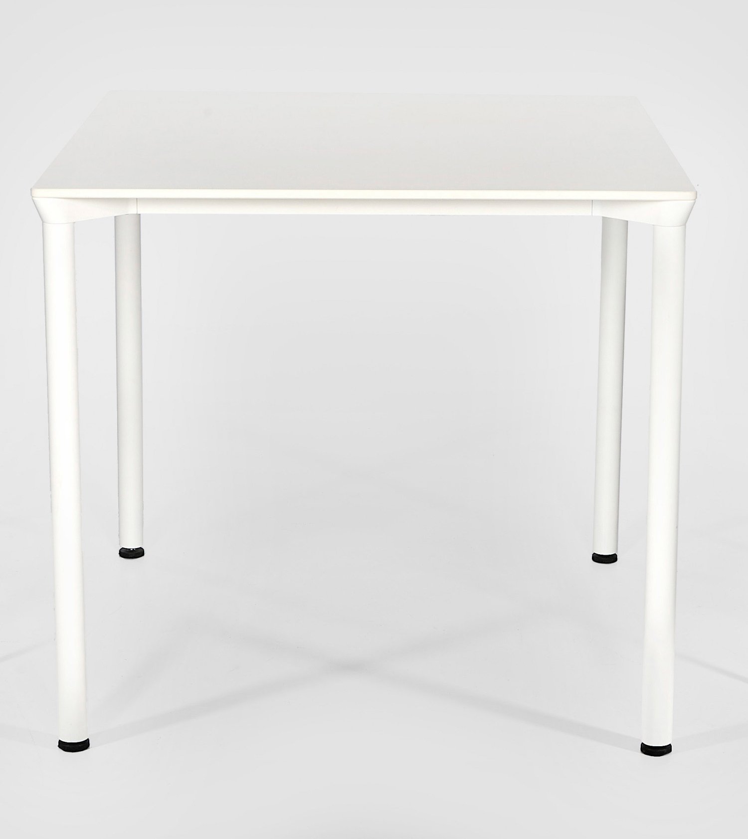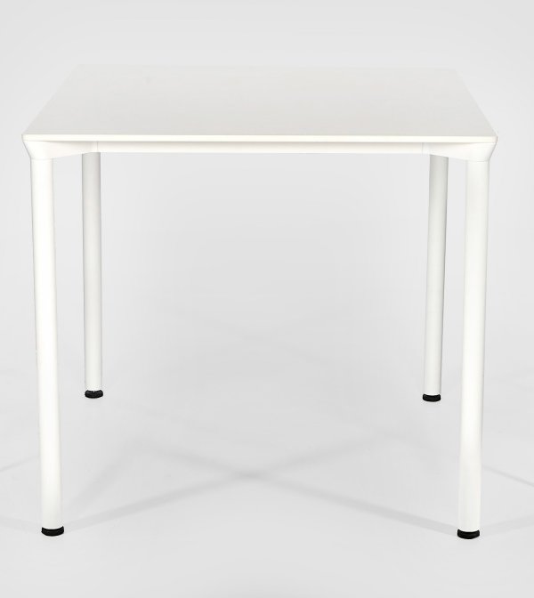 Aluminium weiß pulverbeschichtet sowie weißes Laminat. Schlanke Rundschäfte als Träger für quadratische Deckplatte mit gerundeten Ecken. Herstellerzeichen. H. 73 cm. 80 cm x 80 cm.