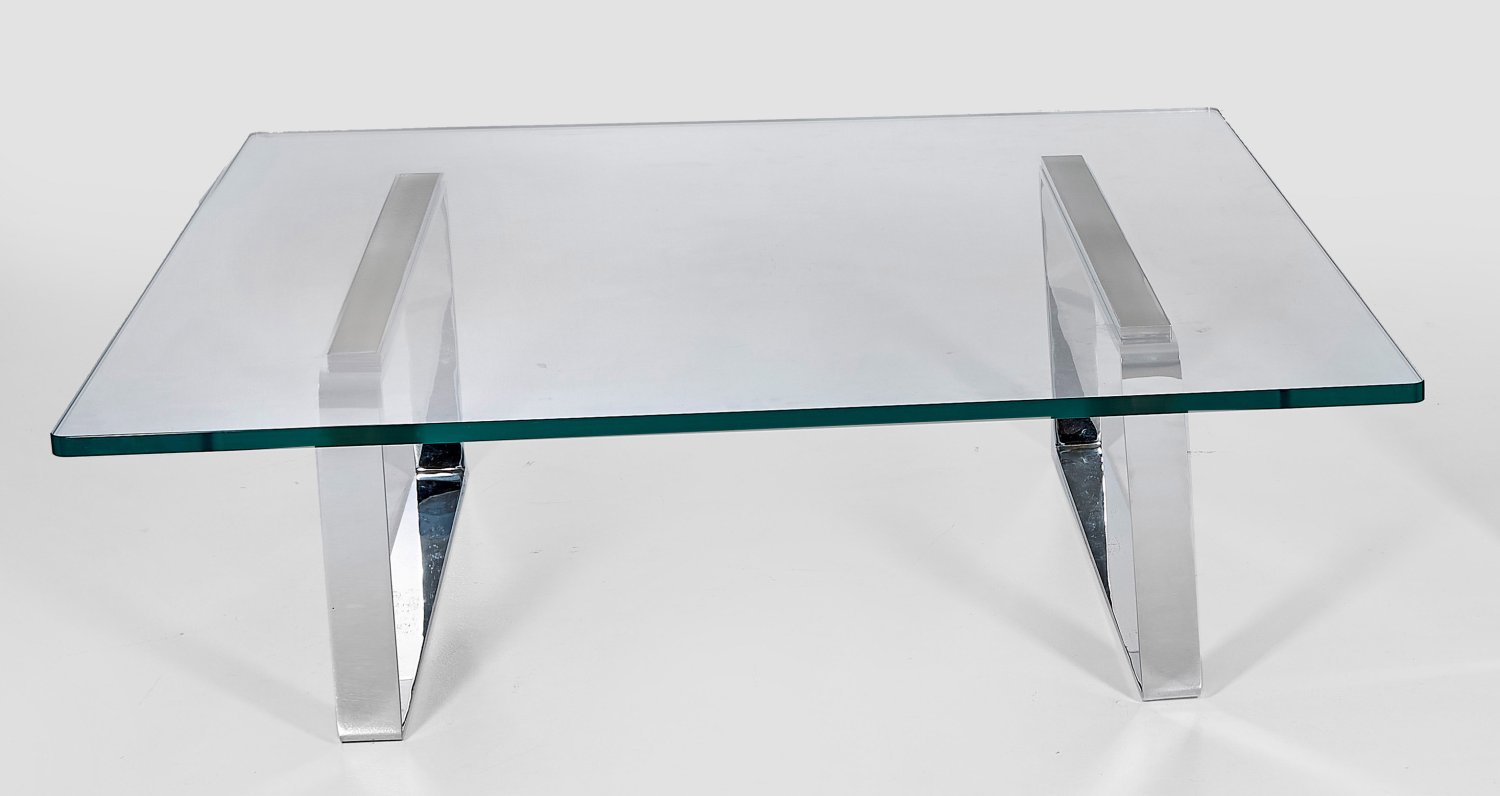Stahl, verchromt und farbloses Glas. Offen gestaltete, rechteckige Stützen mit gerundeten Ecken als Träger für weit überstehende, quadratische Deckplatte. Unbez.; H. 38 cm. 120 cm x 120 cm.