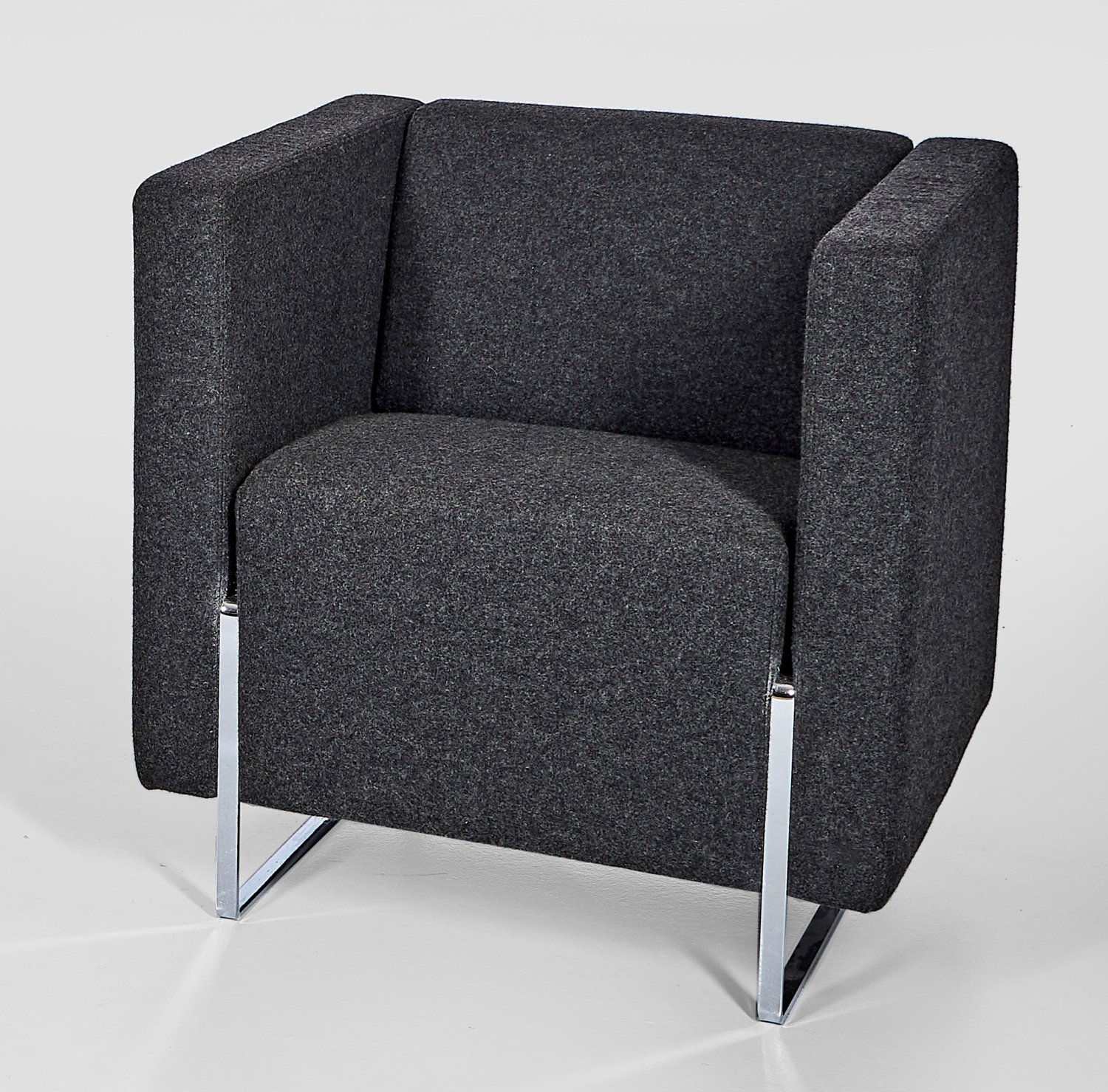 Verchromter Stahl und anthrazitfarbener Filz. Über schmalen, gekanteten Kufen kubenartiger Korpus mit schmalen Armlehnen und innen schräggestellter Rückenlehne. Herstellerzeichen. H. 70 cm. 68 cm x 68 cm. Sitz-H. 44 cm.