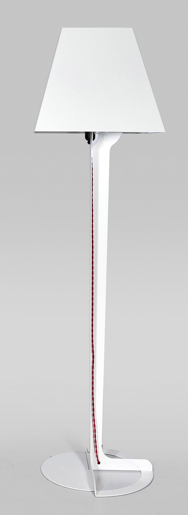 1-flg.; Pulverbeschichteter Stahl in Weiß. Flache, durchbrochen gearbeitete Basis, davon ausgehend abgekanteter Schaft als Träger für konischen Lampenschirm. Rotes Stoffkabel. Elektrifiziert. Herstellerzeichen. Entw. Alexander Taylor. H. 155 cm.