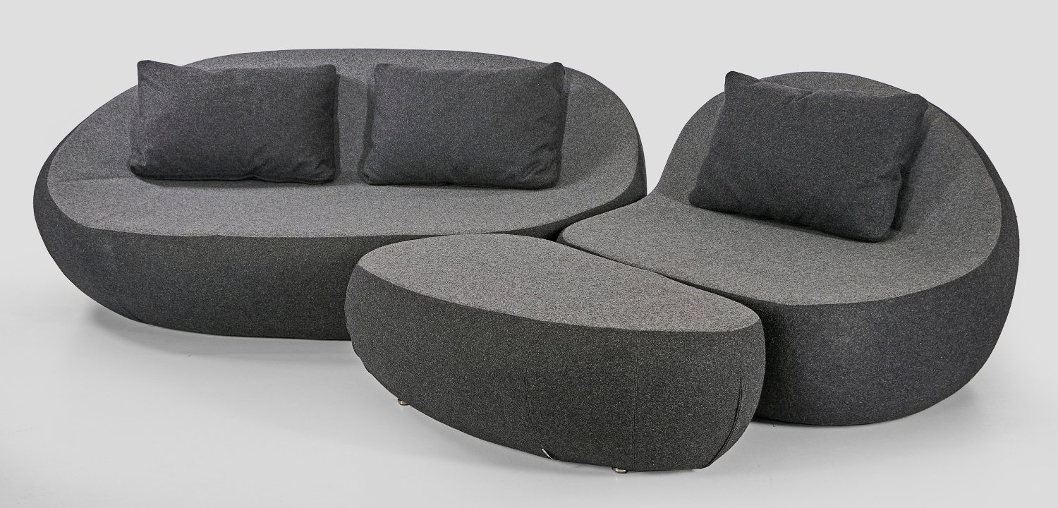 3-tlg.; Sofa, Sessel und Hocker. Dunkel- bzw. hellgrauer Filz. Organisch geformte, zusammenstellbare Elemente, allseitig gepolstert und flächendeckend bezogen. Lose Kissen. Herstellerzeichen. Entw. Barbara Goltermann. Sofa-H. 74 cm. 195 cm x 121 cm. Sessel-H. 73 cm. 132 x 113 cm. Sitz-H. 36 cm.