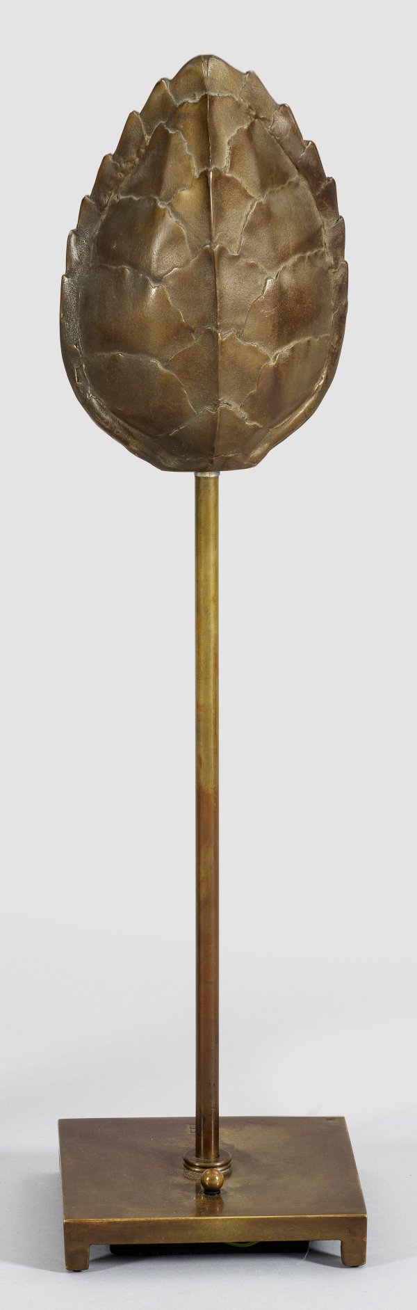 1-flg.; Messing. Über flachem quadratischen Sockel auf gekanteten Füßen, schlanker Rundschaft als Träger für Leuchtmittel. aufstell- bzw. kippbarer Lampenschirm in Form eines Schildkrötenpanzers. Herstellerzeichen. Elektrifiziert. Entw. Peter Ghyczy, 2005. H. 45 cm bzw. 60 cm.