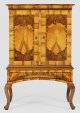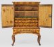 Nussbaum, furniert sowie Einlagen aus Zwetschgenholz. Gerader, einschübiger Zargenkasten auf stark geschwungenen Volutenbeinen. Oberhalb zweitüriger Aufsatz mit gekehltem Profilgesims. Innen Ablageflächen und erg. Schubladen. Flächendeckend breit gerahmte Furnierfelder, von Bandeinlagen begrenzt. Erg.; H. 170 cm. 112,5 cm x 50 cm.