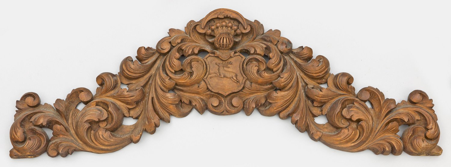 Nussbaum, reliefplastisch geschnitzt. Geschweift ansteigender, durchbrochen gearbeiteter Korpus aus üppigen, eingerollten Blattvoluten. In der Mitte Wappenkartusche wohl der Familie von Hirsch mit Helmzier und Freiherrenkrone. Oberhalb quergelegte Mondsichel. 42 cm x 119 cm.