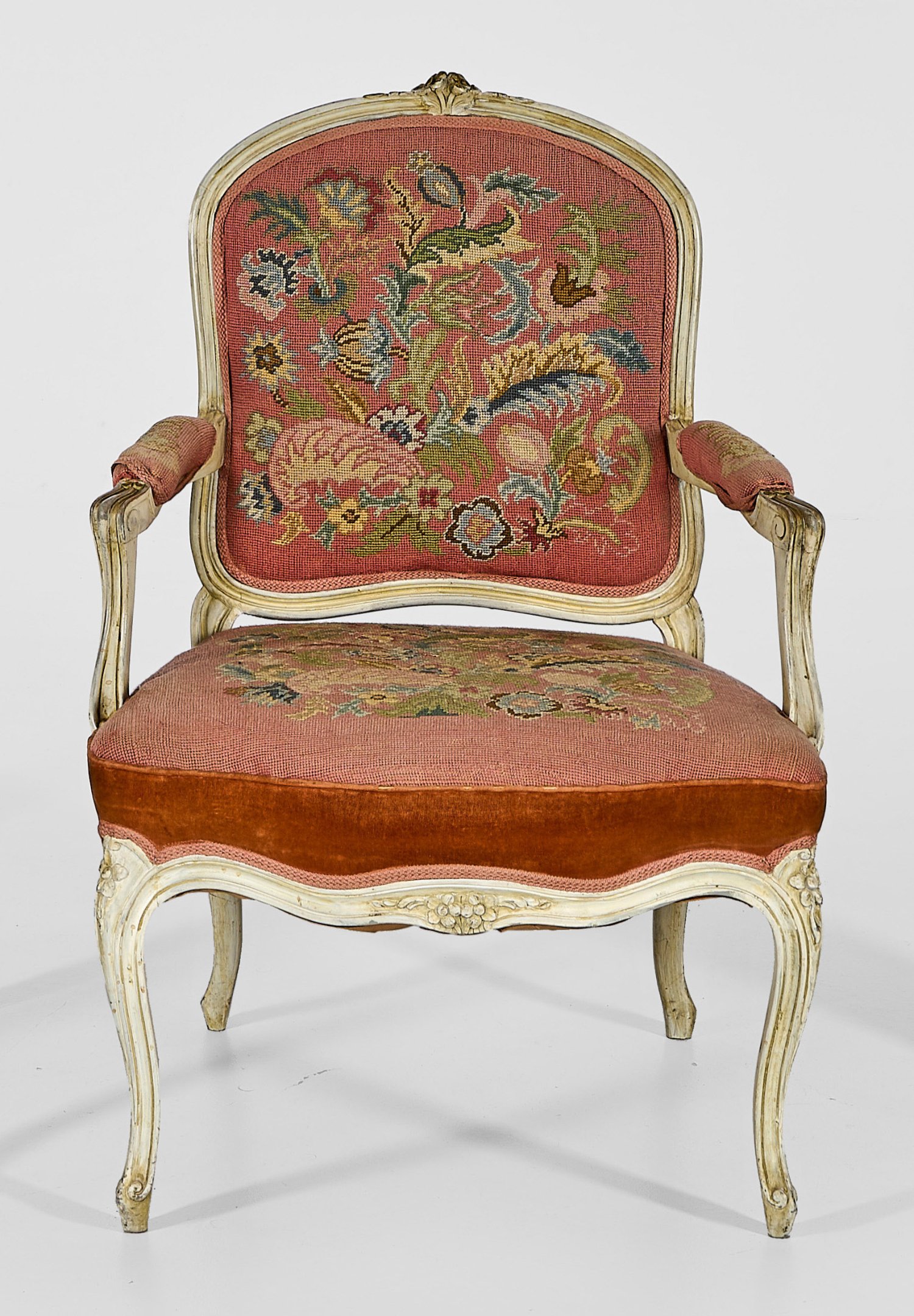 Holz, geschnitzt und creme-weiß gefasst. Bombierte Zarge auf geschweiften Beinen. Kurze Stütze für schmale Armlehnen. Schildförmige Rückenlehnenrahmung mit Blütenbekrönung. Gepolstert und mit roséfarbenem Gobelin bezogen. H. 93 cm. 64 cm x 55 cm. Sitz-H. 44 cm.