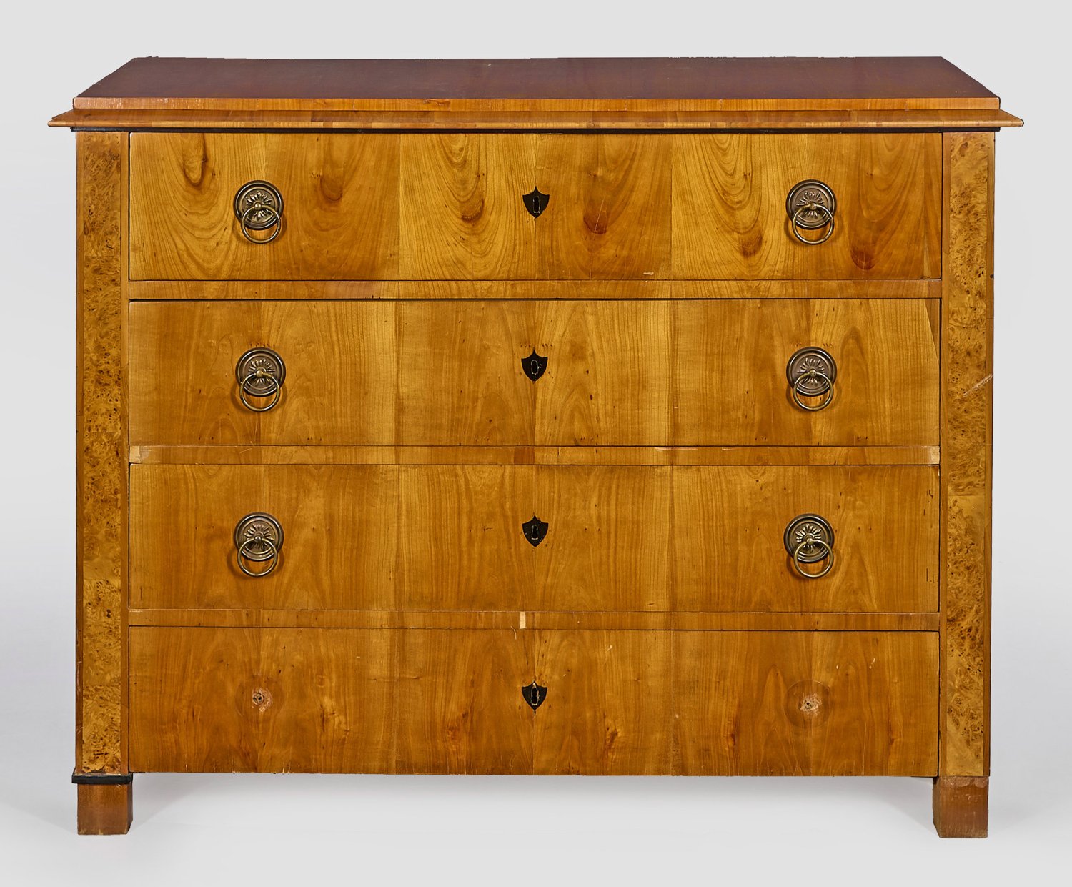 Kirschbaum, furniert. Gerader, rechteckig angelegter Korpus auf gekanteten Füßen. In der gegliederten Front vier breite Schubladen. Gering überstehende Deckplatte. Erg. und Altersspuren. H. 99 cm. 128 cm x 61,5 cm.