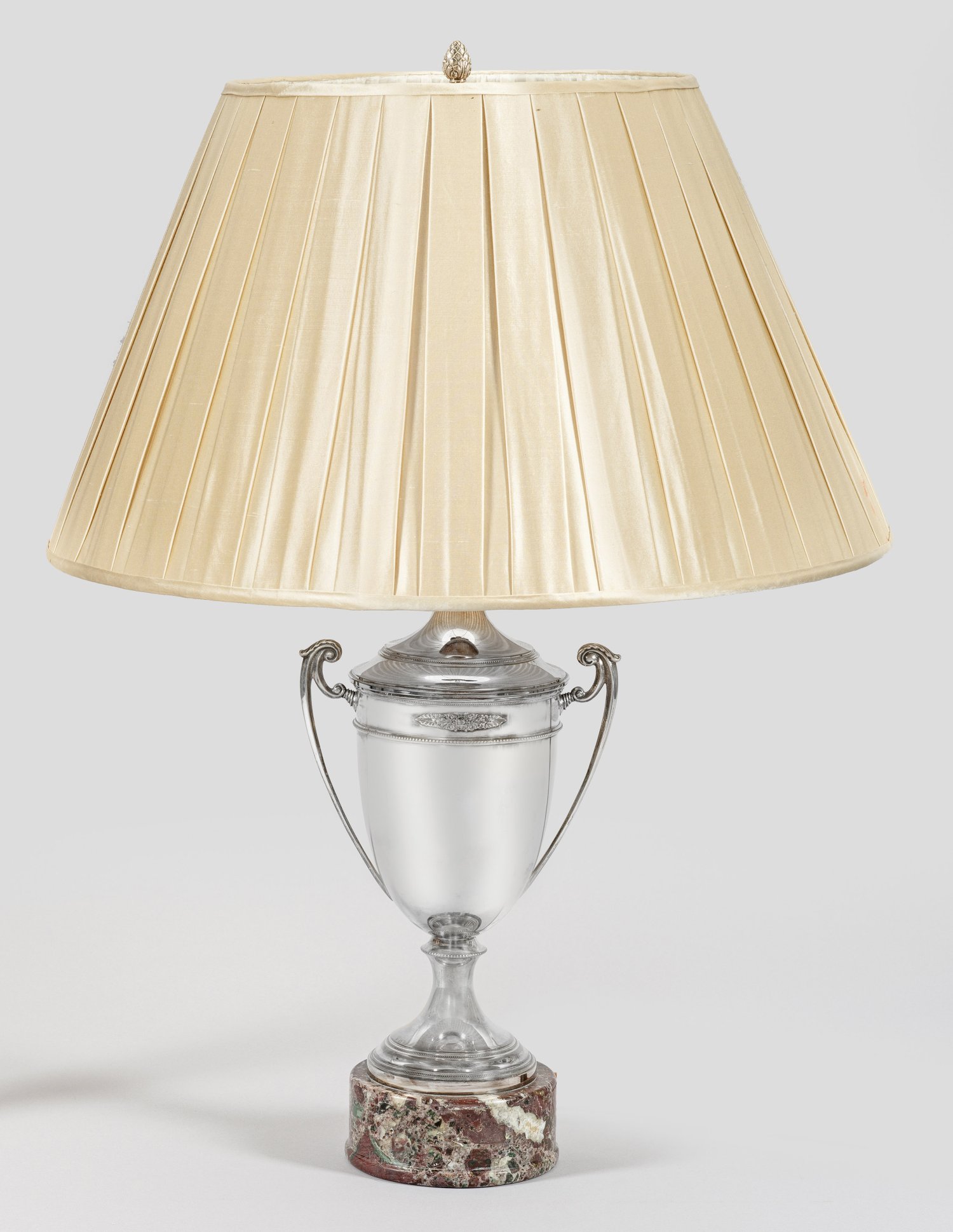Silber und rötlich-violetter Marmor. Über rundem Sockel und trompetenförmigem Stand konischer Vasenkorpus mit hochgezogenen, volutenförmigen Henkeln. Schlanker Schaft als Träger für Leuchtmittel. Konischer Lampenschirm. Elektrifiziert. Gest. 800, Beschauzeichen mit Herstellerzeichen und -nummer "6". H. 73,5 cm.