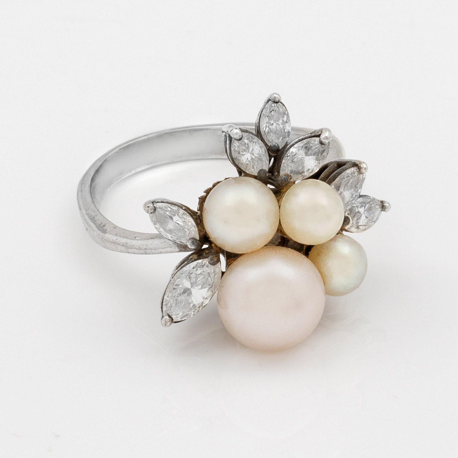 Ring set with white culture pearls approx. 4,2 mm - 7,4 mm and diamonds approx. 0,80 ct., in 18 k white gold.