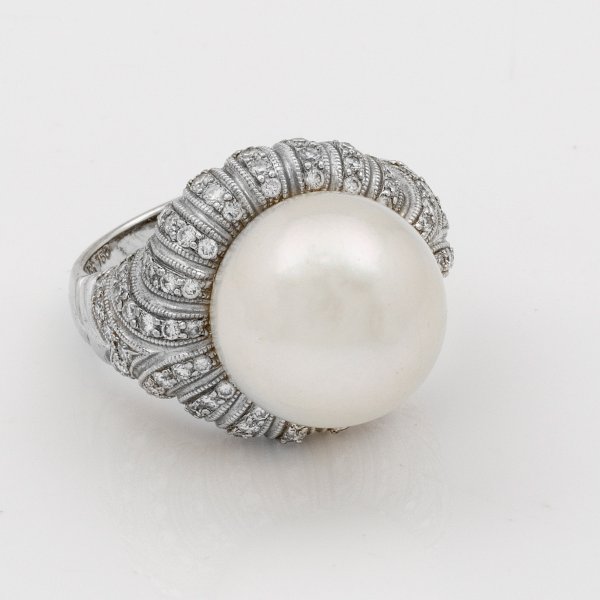 Ring set with a South Sea pearl approx. 14 mm and brilliants approx. 1,00 ct., in 18 k white gold.