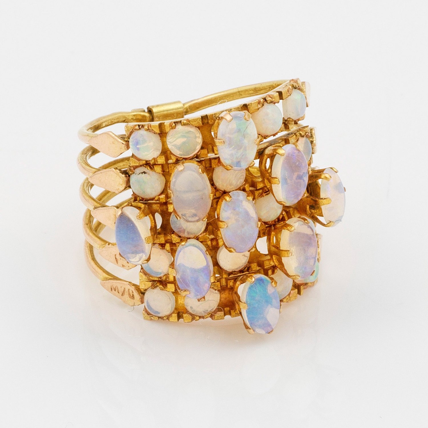 Roségold, 14 ct.; Schauseitig mosaikartig besetzt mit Opalcabochons in sehr schönem Farbspiel. Gew. ca. 6,02 g.