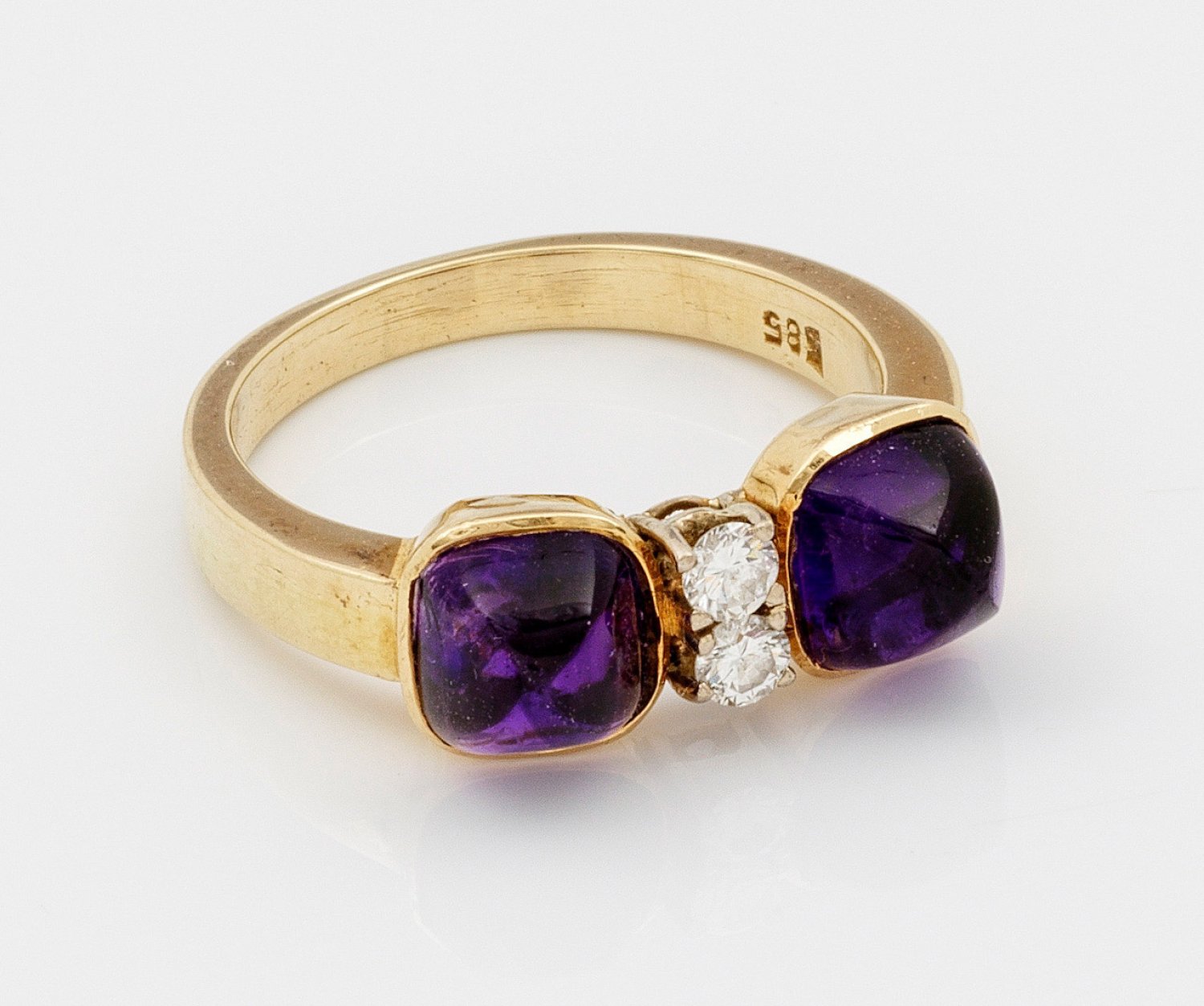Gelbgold, gest. 585. Besetzt mit 2 violetten Amethyst-Cabochons, unterteilt durch 2 Brillanten von zus. ca. 0,20 ct.; Gew. ca. 5,11 g.