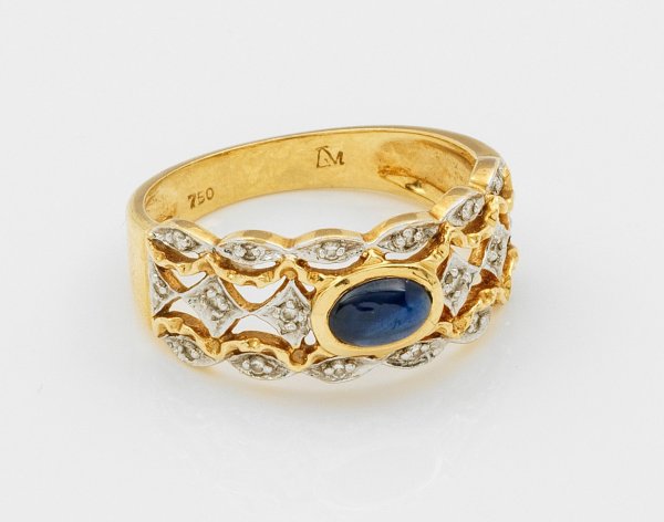 Gelbgold, gest. 750. Zentral besetzt mit einem Saphir-Cabochon und kleinen Diamanten. Gew. ca. 4,36 g.