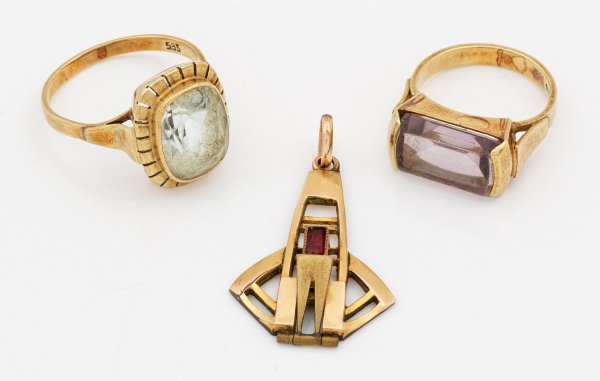 Zwei Ringe und ein Anhänger. Gelbgold, gest. 585, und vergoldet. Besetzt mit Farbsteinen. Ges.-Gew. ca. 12,91 g.