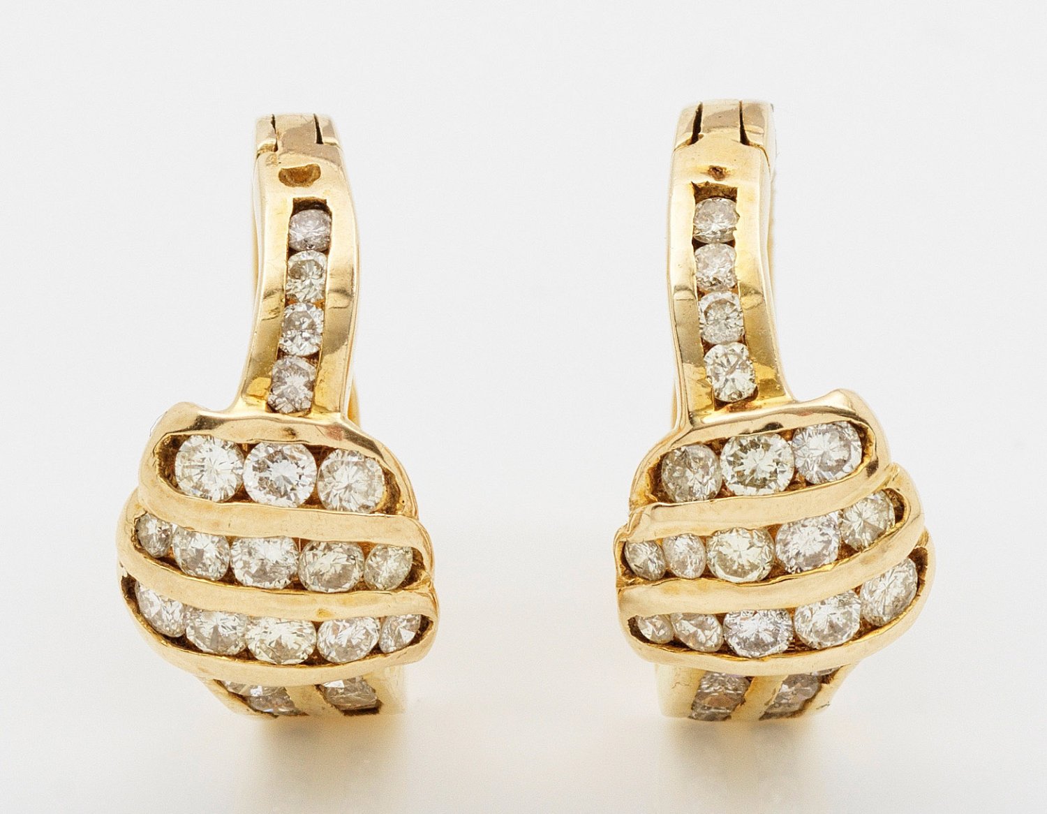 Gelbgold, 14 k.; Knotenförmig gearbeitete Creolen schauseitig besetzt mit Brillanten von zus. ca. 1,00 ct. ; Ges.-Gew. ca. 5,68 g.