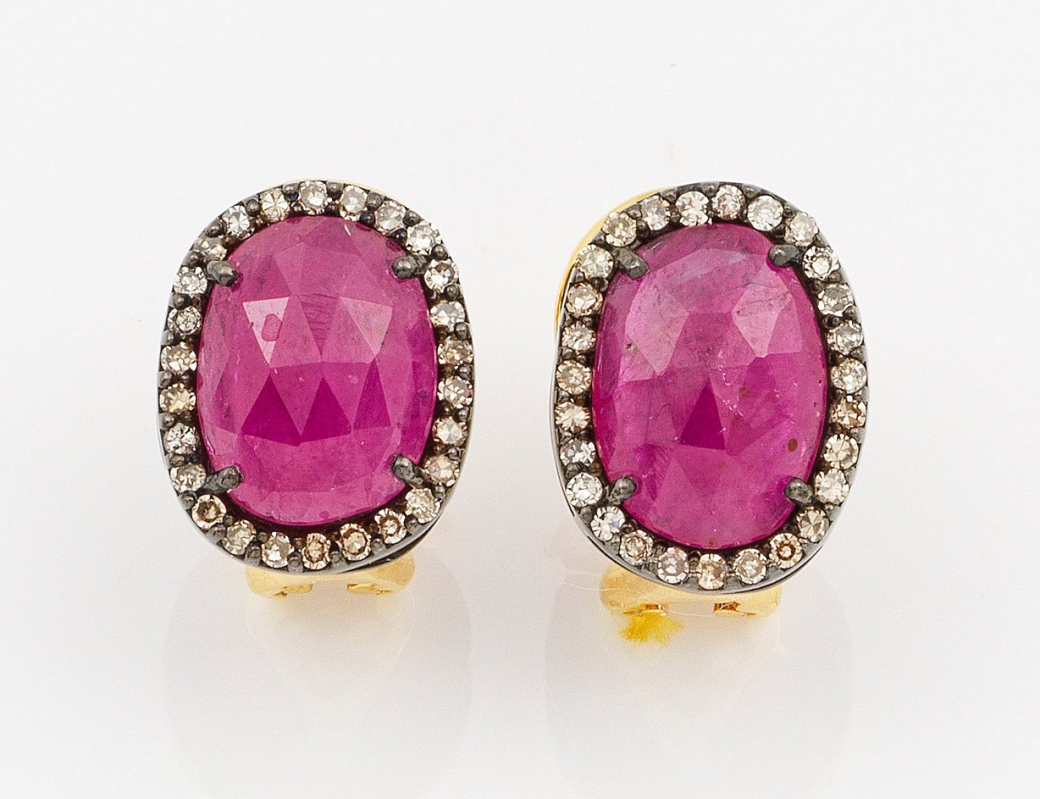 Pair of earrings set with two pigeon blood red rubies approx. 3,81 ct. and diamonds approx. 0,35 ct., in 14 k gold and silver.