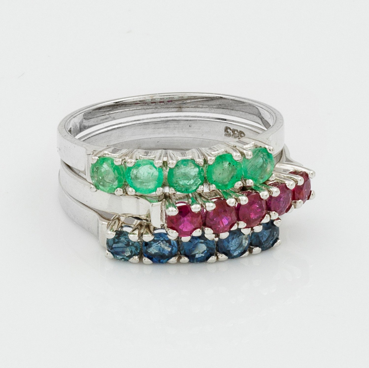 Three multicoloured rings set with sapphires, rubies and emeralds approx. 1,50 ct., in 14 k white gold.