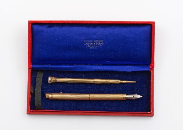 A German gilt brass fountain pen and pencil holder. Minor flaws. Case from the Berlin jeweller J. Godet & Söhne.