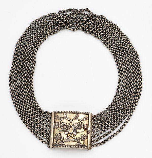 Silber. Acht übereinander angeordnete, unterschiedlich lange Ketten mit gebogtem, rechteckigem Verschluss. Darauf reliefplastische Blüten und Blattranken. Gest., Beschauzeichen, Meisterzeichen "IID" (?). Gew. ca. 240 g. L. 44,5 cm.