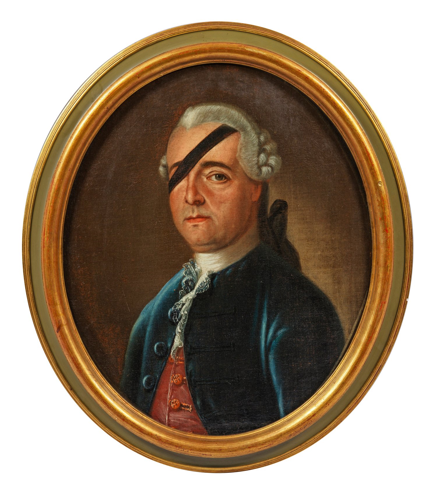 Künstlerisch herausragendes, durch sein Motiv außergewöhnliches Bildnis des Spätbarock oder Rokoko. Dies zeigt einen Herrn mittleren Alters in modischer, höfischer Kleidung (rote Weste und dunkelblaue Samtjacke), den Kopf mit weißer Perücke fast en face mit intensivem, selbstbewusstem Blick auf den Betrachter gerichtet, das rechte Auge von einer diagonalen, schwarzen Augenbinde verdeckt. Öl/Lwd.; 59 cm x 48 cm. Rahmen.