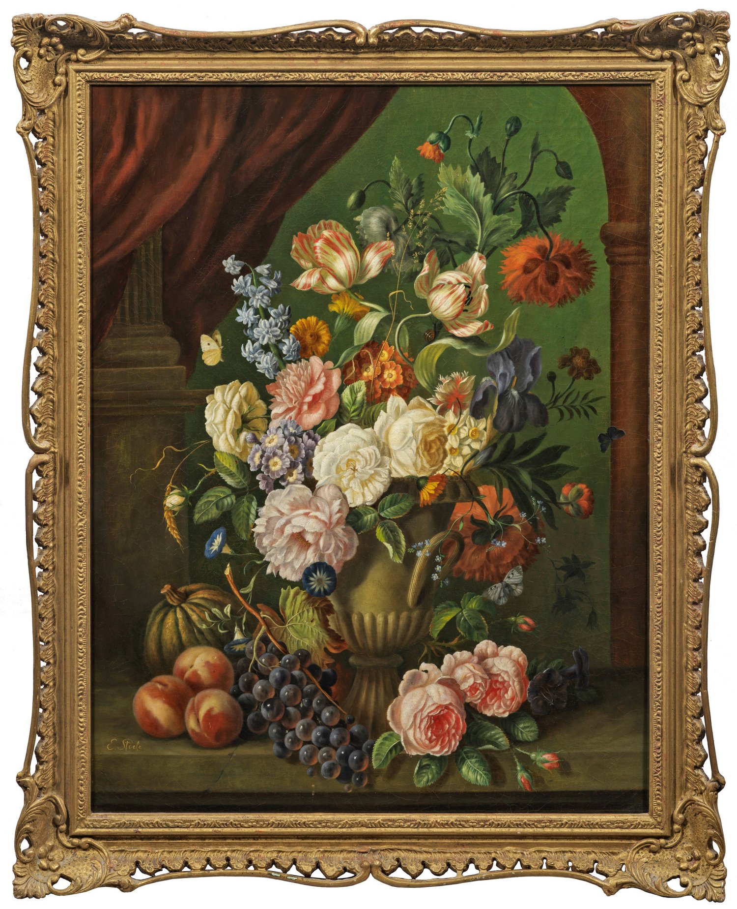 Opulenter, in einer Vase arrangierter Strauß, der vor einer Säule und einem Vorhang platziert wurde, belebt durch Schmetterlinge. Edwin Steele und sein gleichnamiger Sohn arbeiteten beide als Stilllebenmaler, sodass beide als Schöpfer dieses Prunkstilllebens in Frage kommen. Öl/Lwd. doubl.; L. u. sign. "E Steele". 91,5 cm x 71 cm. Rahmen.
