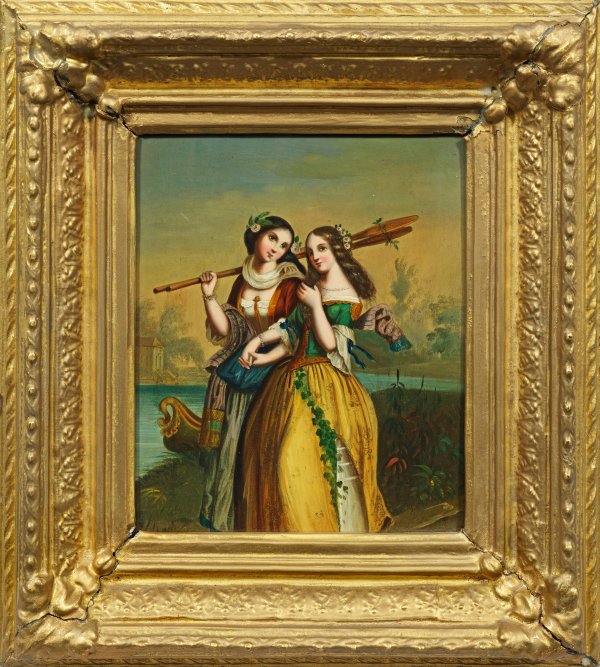 Spätbiedermeierliches, fein lasierend ausgeführtes Genrebild. Öl-Lackmalerei/Metalltafel. L. u. undeutl. bez.; 20,5 cm x 17 cm. Rahmen.