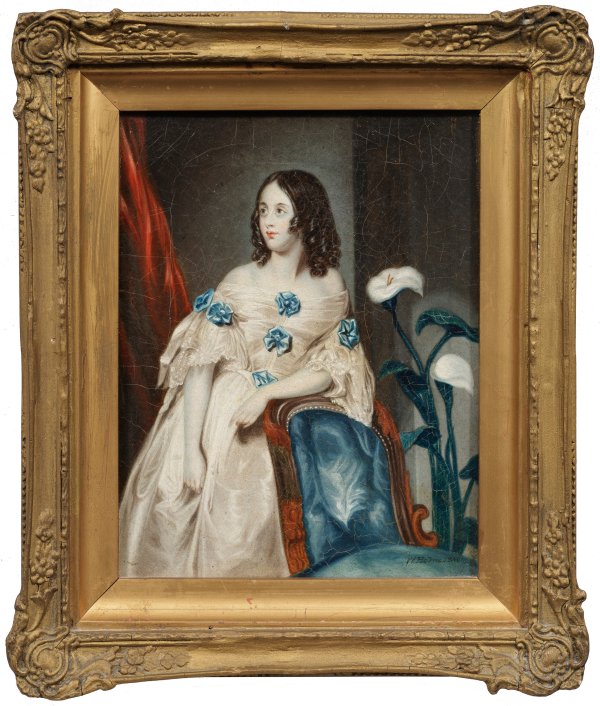 Feinmalerische Darstellung der Tochter George Howards, sechster Graf von Carlisle, nach einem Werk von John Bostock (um 1808 - um 1872), das 1838, gestochen von William Henry Mote (1803-1871), in Fairlie's "Portraits of the Children of the Nobility" (London) erschien. Öl/Lwd., kaschiert auf Karton. R. u. sign. und dat. 1840. Ca. 21 cm x 16,5 cm. Rahmen.