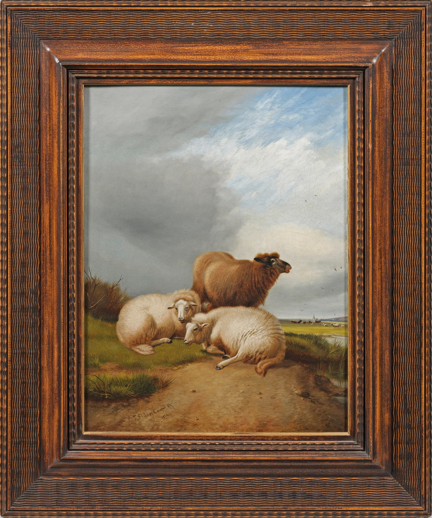 Charakteristisches Werk des bekannten Malers mit naturnah und lebendig geschilderter Tierdarstellung unter stimmungsvollem Wolkenspiel. Cooper studierte an der Royal Academy in London und lernte 1827-1830 in Brüssel bei Eugène Verboeckhoven. Wegen der Belgischen Revolution kehrte Cooper nach London zurück, wo er ab 1833 alljährlich in der Royal Academy ausstellte. Hauptsujets waren Schafe und Rinder, die ihm den Beinamen "Cow Cooper" einbrachten. 1845 wurde Cooper zum Associate der Royal Academy (ARA) und 1867 zum Royal Academician (RA) gewählt. Als ältestes Mitglied der Royal Academy of Arts ernannte ihn König Edward VII. 1901 zum Kommandeur des Royal Victorian Order (CVO). Öl/Lwd. (Malwarenhersteller Winsor & Newton, London). L. u. sign. und dat. 1872. 45,8 cm x 35,5 cm. Rahmen.