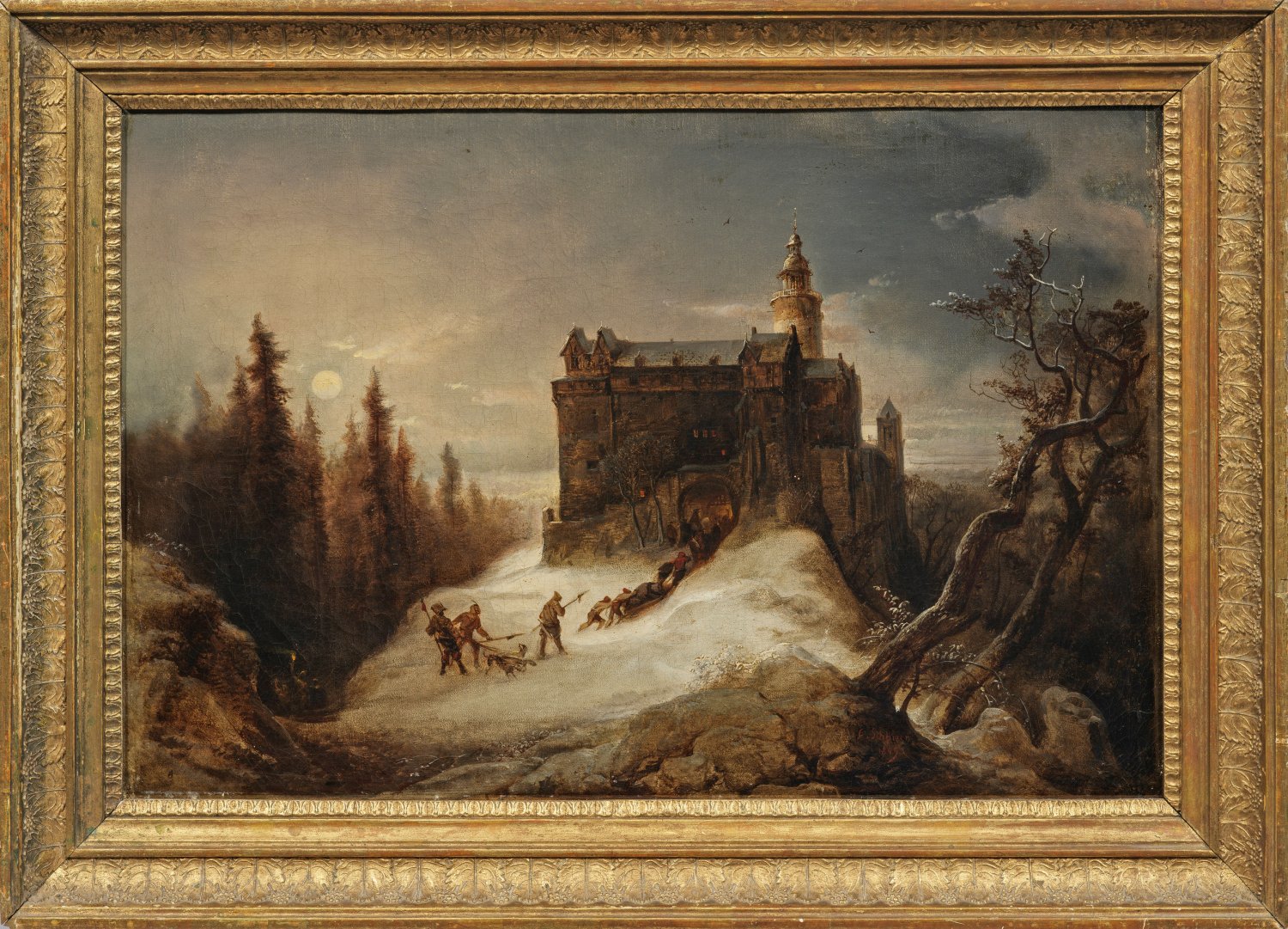 Winterliche Mondscheinlandschaft mit heimkehrenden Bärenjägern vor Burg Falkenstein