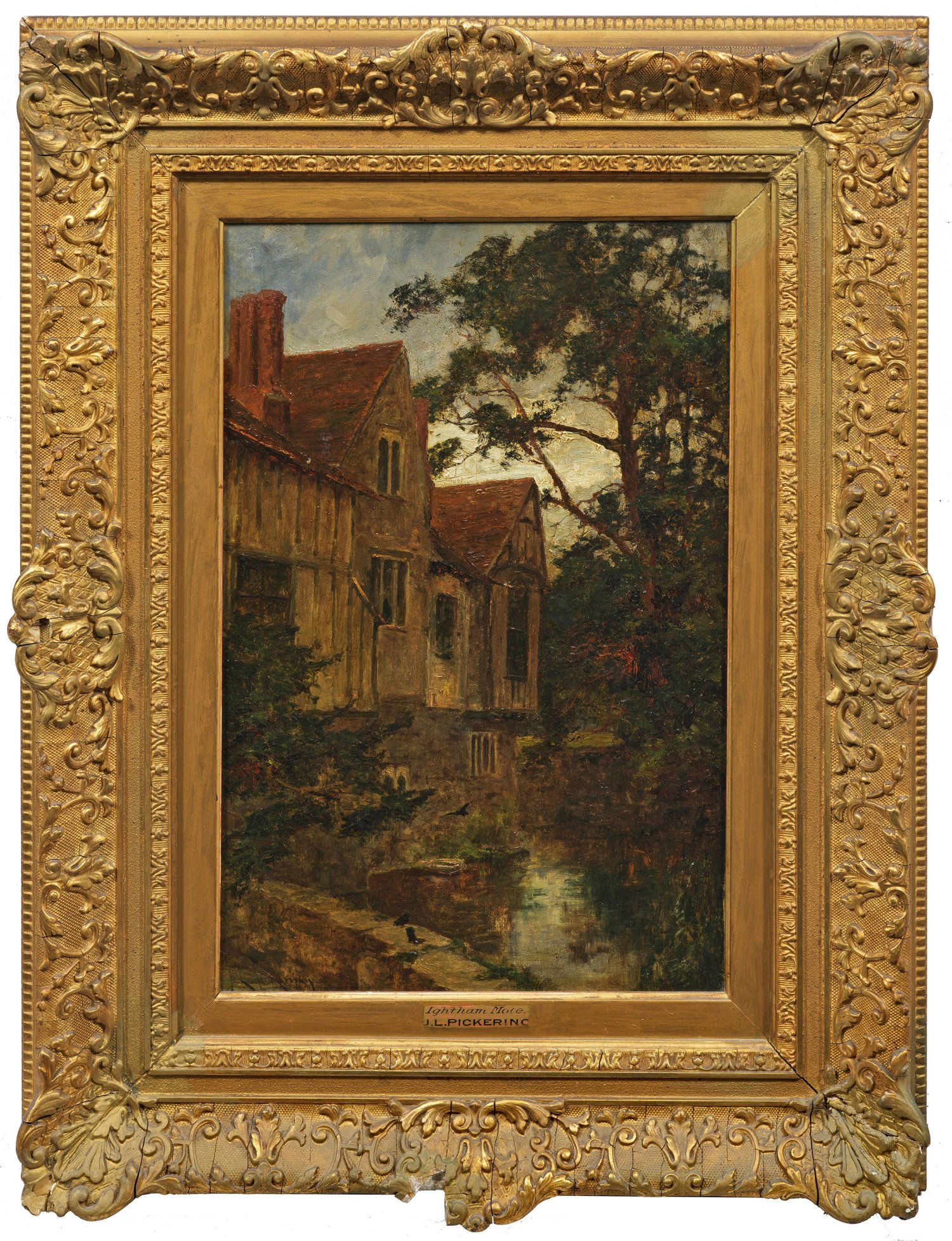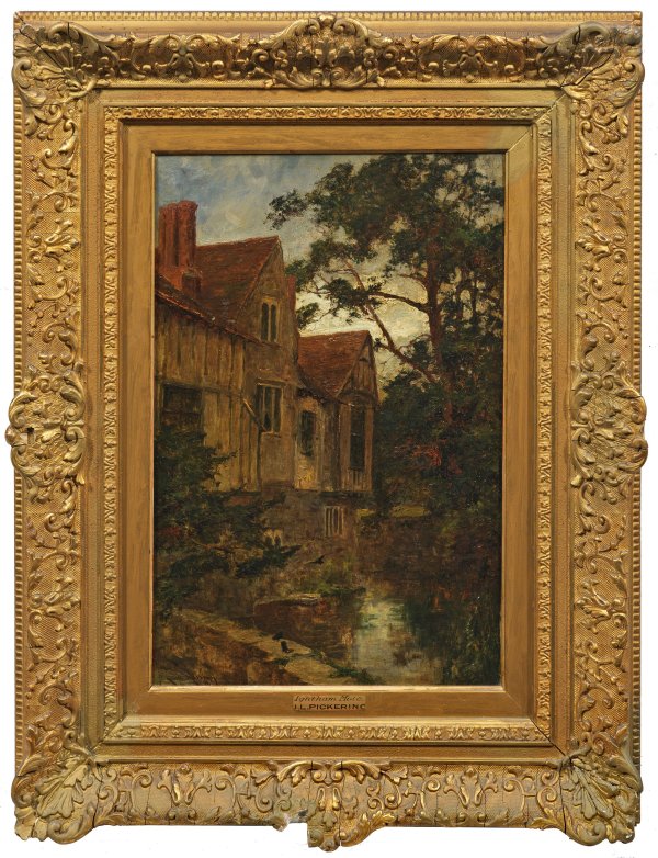 Blick auf das bekannte mittelalterliche Herrenhaus mit Wassergraben in der Nähe des Dorfes Ightham bei Sevenoaks in der englischen Grafschaft Kent. Von der Schule von Barbizon beeinflusste Landschaftsimpression Pickerings, der seit 1874 regelmäßig in der Royal Academy ausstellte. Öl/Lwd.; L. u. sign.; Verso wohl eigenhändig bez., betitelt u. dat. July 1892. 45,5 cm x 30,5 cm. Rahmen.