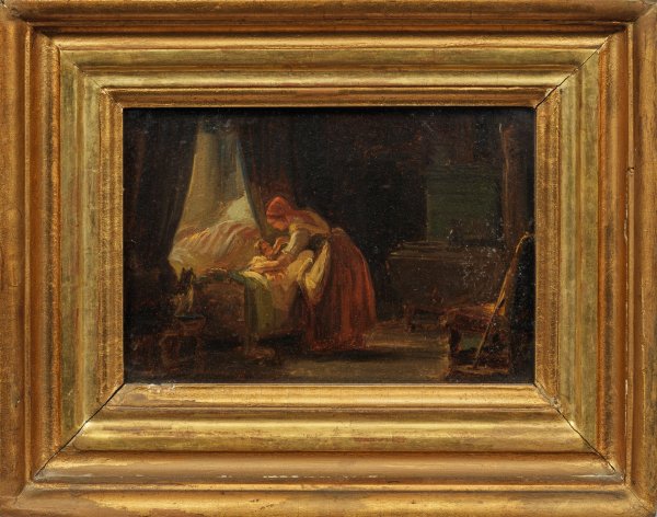 Blick in eine gemütliche, bäuerliche Stube, in der die Mutter gerade liebevoll ihr Kind ins Bett legt und zudeckt. Mit lockerem Duktus und warmem, tonigem Kolorit gemalte Genrestudie, wie sie Wilhelm Busch mit Vorliebe anfertigte. Öl/Papier, kaschiert auf Holztafel. Verso alte Zuschreibung und Bez.; Ca. 15 cm x 21 cm. Rahmen.