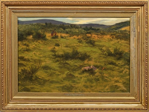 Stimmungsvolle, subtil kolorierte Moorimpression des schottischen Malers, der Schüler von Peter Graham war. Farquharson wurde besonders für seine effektvollen Stimmungslandschaften geschätzt, die er mit Vorliebe direkt in der Natur bei poetischem Morgen- oder Abendlicht einfing. Öl/Lwd. (Malwarenstempel von Winsor & Newton, London); L. u. sign.; dat. "Oct. 13 / (18)92". Auf dem Rahmen handschriftlich bez. mit Ortsangabe; 51 cm x 76,3 cm. Rahmen.