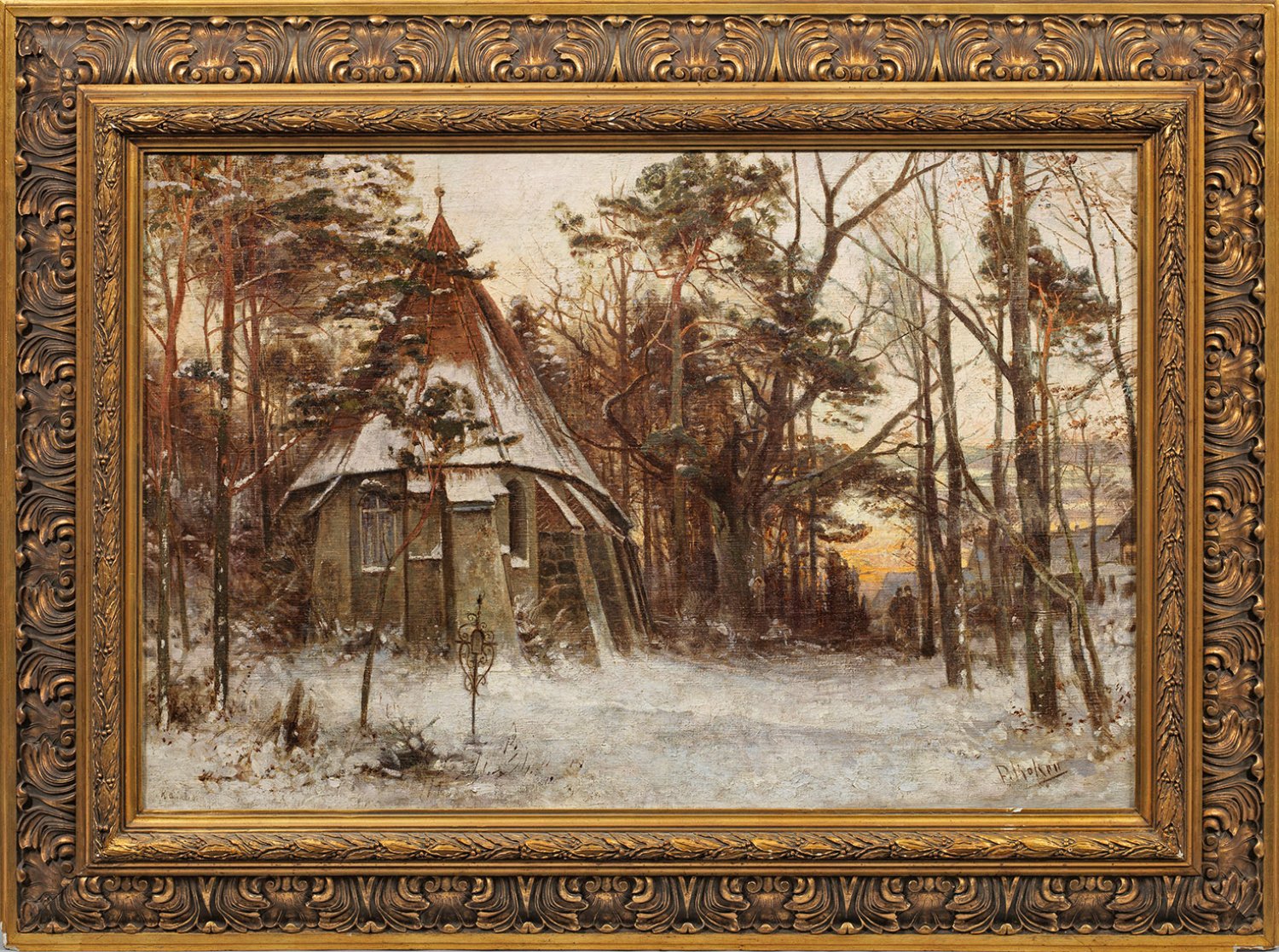 Großformatige, im Licht der untergehenden Wintersonne stimmungsvoll gemalte, charakteristische Landschaftsimpression Kokens, der zunächst bei seinem Vater Edmund Koken lernte und später bei Adolf Lier in München und Theodor Hagen in Weimar studierte. Ab 1872 stellte er oft im Kunstverein Hannover aus und beschickte die Dresdener Akademie-Ausstellungen. Öl/Lwd.; R. u. sign.; L. u. bez.; 64 cm x 96 cm. Rahmen.