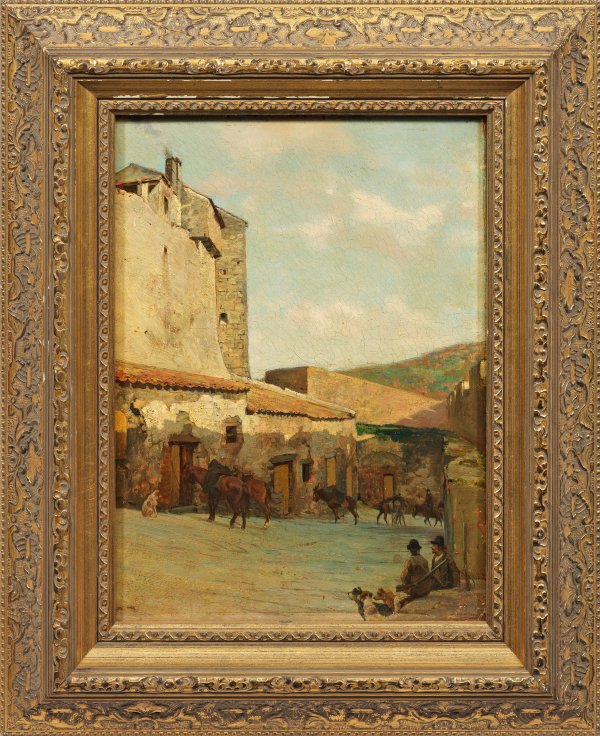 Stimmungsvolles Werk Aernis, der ab 1874 bei Salomon Corrodi an der Accademia di San Luca in Rom studierte und in Italien vor allem Landschaften, Veduten und Darstellungen des Alltagslebens schuf. Öl/Eichenfatel. R. u. sign.; 38,8 cm x 29,4 cm. Rahmen.