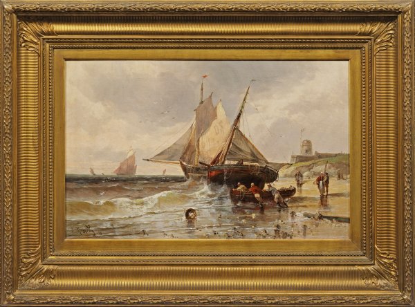 Motiv- und stiltypische Stimmungslandschaft des Künstlers, der sich auf Fischermotive spezialisierte, die er wohl nach Studien in der Normandie malte. Öl/Lwd.; L. u. sign. u. dat. (18)83. 41 cm x 64,5 cm. Original-Rahmen.