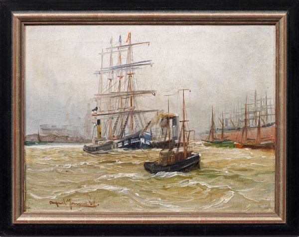 Für den deutsch-dänischen Marinemaler charakteristisches Motiv, das die Atmosphäre im noch von Segelschiffen erfüllten Hamburger Hafen zu Beginn des 20. Jhs. wiedergibt. Jensen fuhr selbst zur See, erhielt seine künstlerische Ausbildung bei Heinrich Leitner in Hamburg sowie an der Akademie in Kassel bei Emil Neumann, bevor er seit 1900 auch als Professor an der Kunstgewerbeschule in Hamburg tätig war. Öl/Lwd.; L. u. sign.; 30 cm x 40,5 cm. Rahmen.