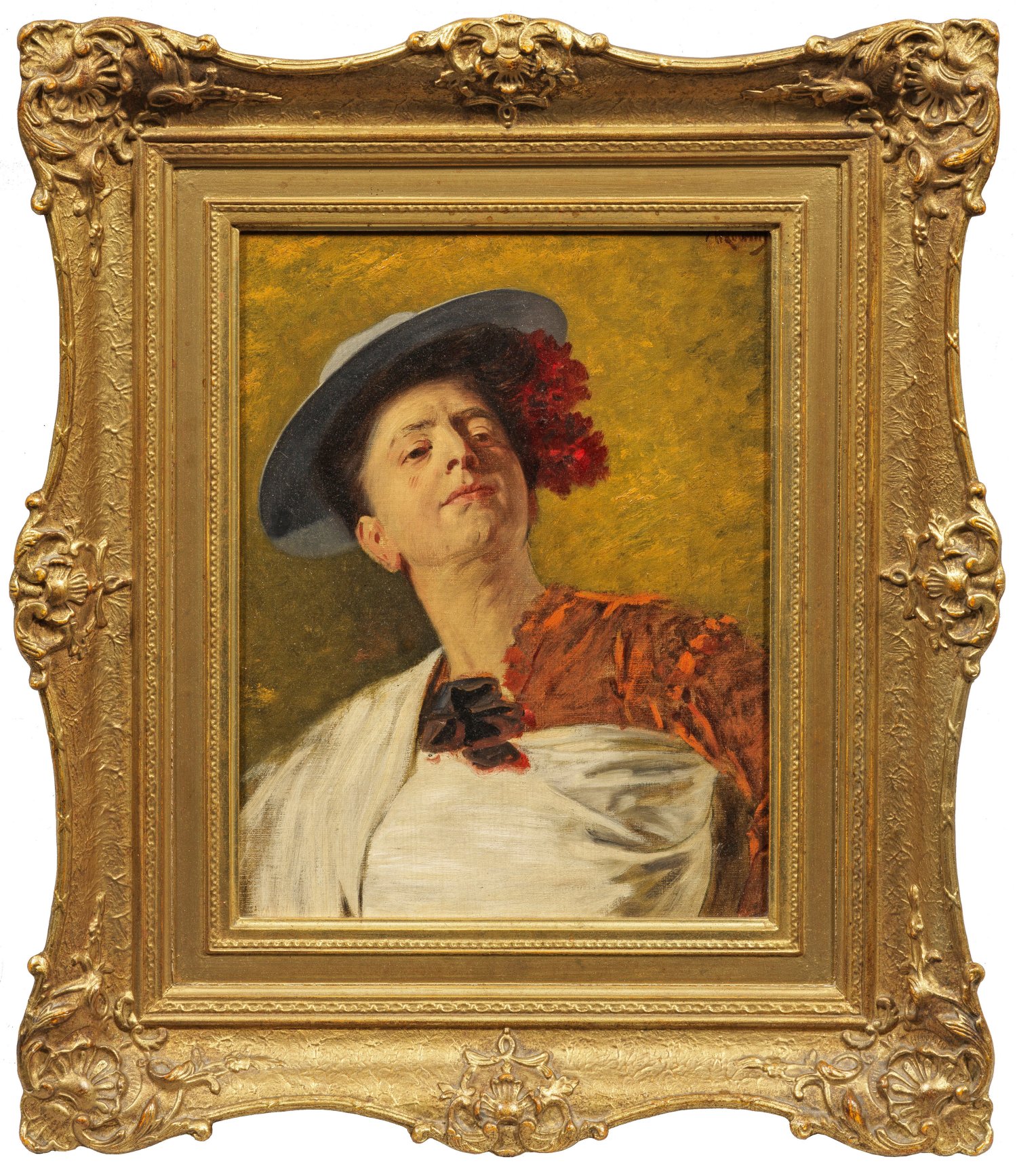 Seltenes, flott gemaltes, weibliches Bildnis Löwiths, der sonst vornehmlich historisierende Herrenrunden und Darstellungen von Kardinälen schuf. Öl/Lwd., auf Karton kaschiert. R. o. sign.; 36 cm x 28 cm. Rahmen.