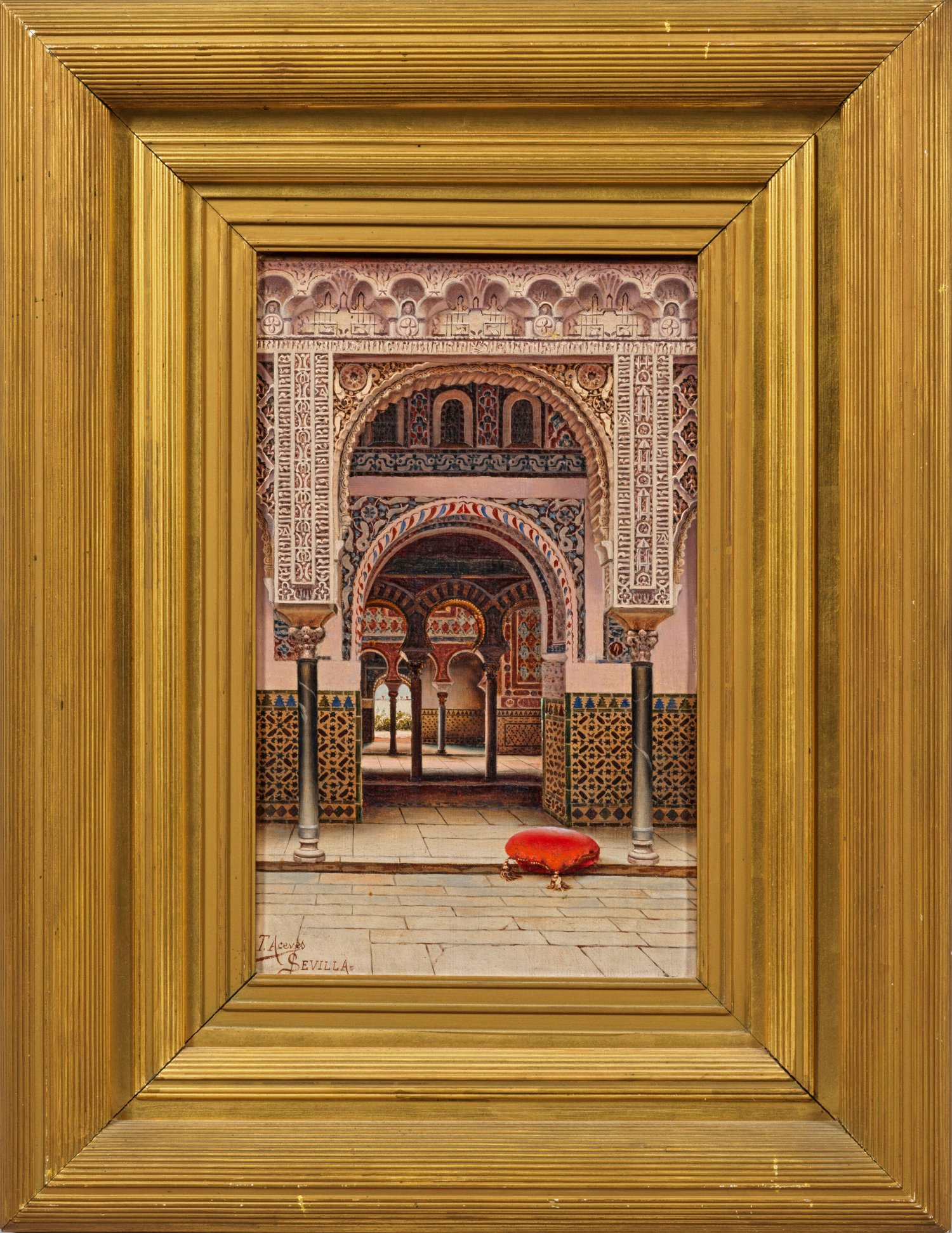 Feinmalerische, reizvolle Ansicht des Königspalastes in Sevilla, die besonders durch ihre subtile Wiedergabe der maurischen Architektur und prächtigen Ornamentik besticht. Charakteristisches Werk des spanischen Künstlers, der sich auf die Schilderung der Palastarchitektur seiner Heimat spezialisiert hatte, deren Baugeschichte zumeist bis in die Maurische Zeit zurückreicht. Öl/Lwd.; L. u. sign. mit Ortsangabe Sevilla. 38,3 cm x 23,3 cm. Rahmen.