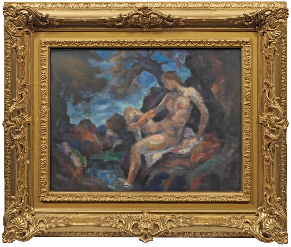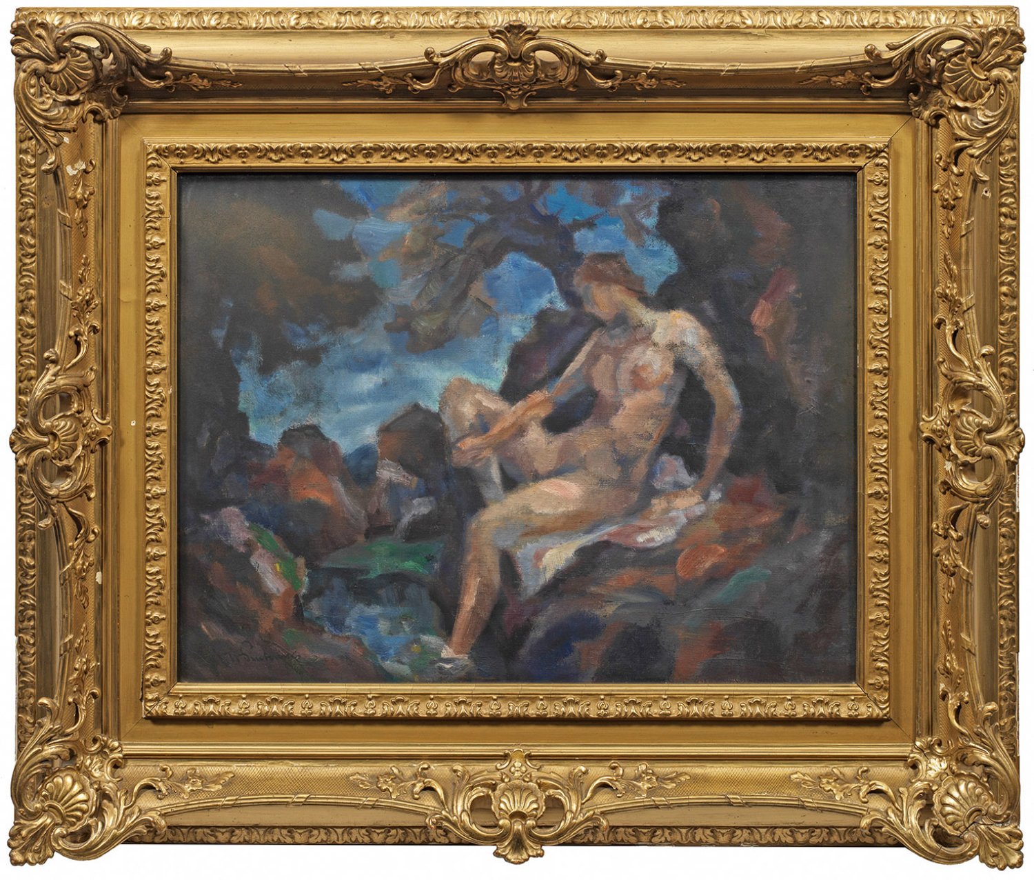 Mit breitem, flächigem Farbauftrag gemalte, expressiv realistische, moderne Darstellung eines sitzenden weiblichen Aktes an einem Quell. Öl/Lwd.; L. u. sign. "Pistorius", verso auf dem Keilrahmen sign. u. betitelt. 45 cm x 60 cm. Rahmen.