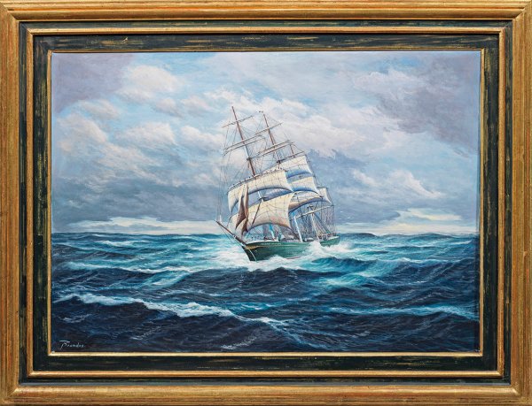 Stimmungsvolle Darstellung des 1896 als Vollschiff vom Stapel gelaufenen Dreimasters (seit 1904 Takelung als Bark), welches seit 1983 als Museums- und Denkmalschiff sowie schwimmendes Wahrzeichen Hamburgs im Hafen bei den St. Pauli-Landungsbrücken liegt. Öl/Lwd.; L. u. sign.; 70 cm x 100 cm. Rahmen.