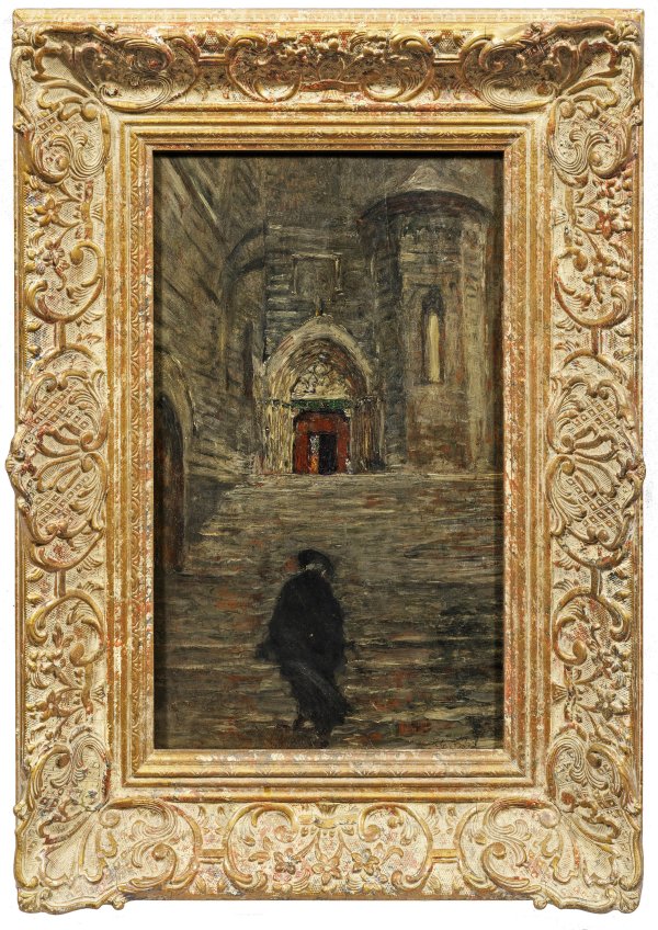 Bekleidet mit einer schwarzen Robe und einem Hut eilt ein Geistlicher die steilen Stufen einer Steintreppe empor, einem Kirchenportal entgegen. Öl/Holzplatte. R. u. undeutl. sign.; 40 cm x 23,5 cm. Rahmen.