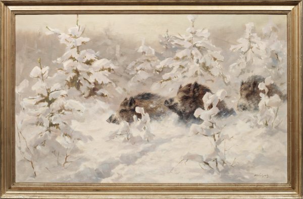 Impressionistisch aufgefasstes Werk des Künstlers, der vor allem Wildtiere in der freien Natur schilderte. Ausgebildet in Stettin und an der Hochschule für Bildende Künste in Berlin, erhielt Schatz seit 1964 eine Reihe von Auszeichnungen für seine Tierbilder. Öl/Lwd.; R. u. sign.; 80,5 cm x 130 cm. Rahmen.